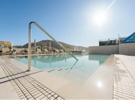 En lo alto del Hotel Reverón, el mundo se abre en calma. La piscina, serena y cristalina, refleja el cielo mientras invita a sumergirse en un instante de pura desconexión. A su alrededor, las hamacas esperan, listas para abrazar cada momento de descanso bajo el sol atlántico.